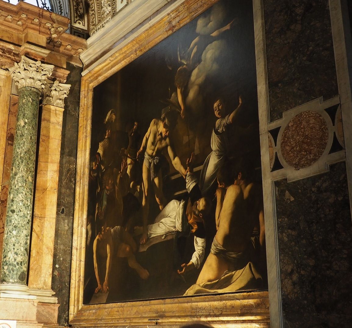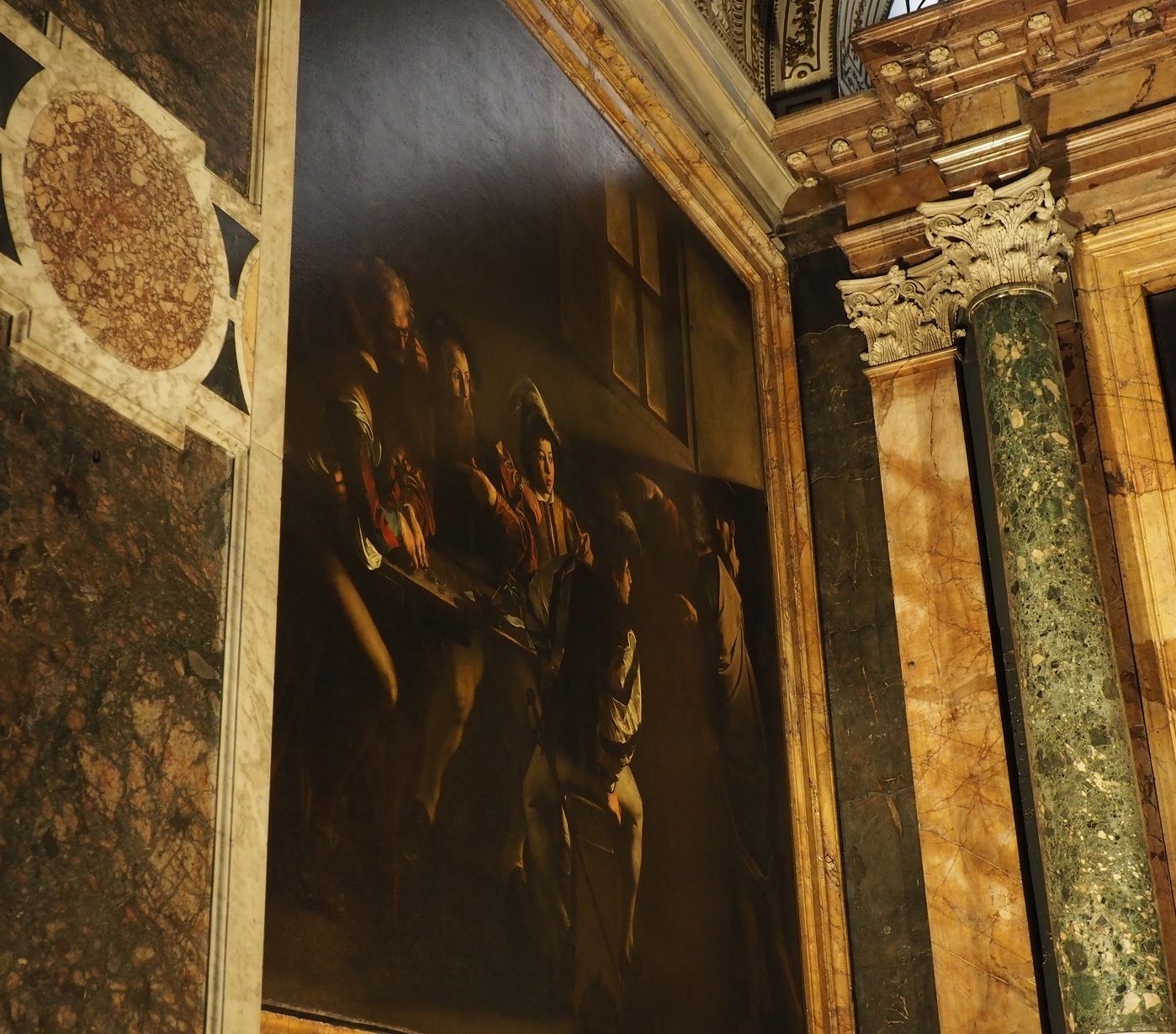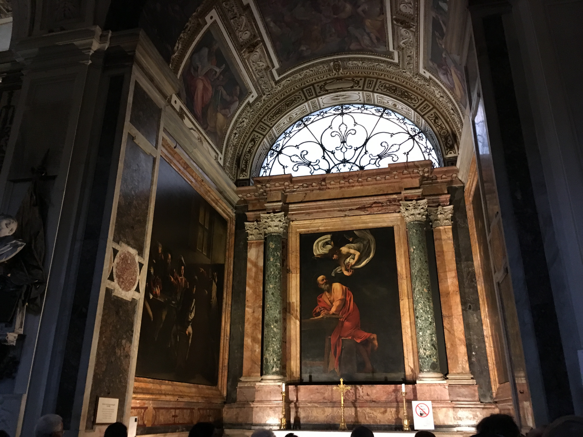 Inside the Contarelli Chapel, there are three massive paintings: The Calling of Saint Matthew, The Inspiration of Saint Matthew, and The Martyrdom of Saint Matthew. You can see the first two in the photo below: